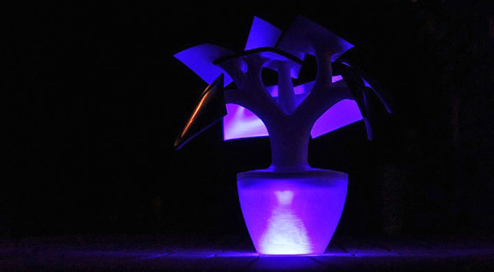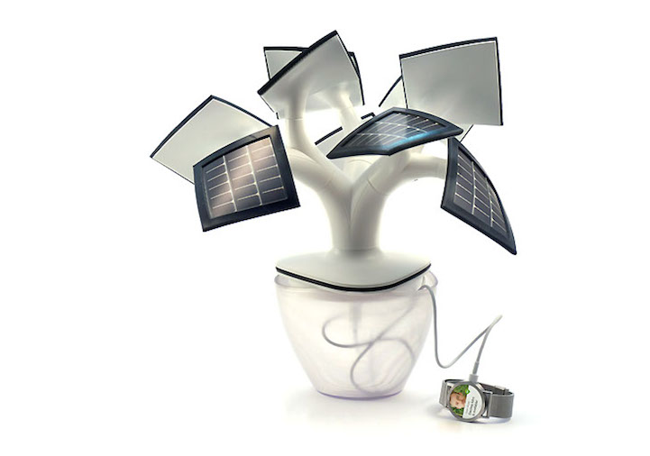 法國設計師 Vivien Muller 的巧思,將太陽能裝置結合盆栽,葉子就是太陽能板,指頭粗的莖部有可轉向設計,幫助太陽能板調整到向陽處,獲得的太陽能會轉化為電力儲存在底部的電池盒裡。