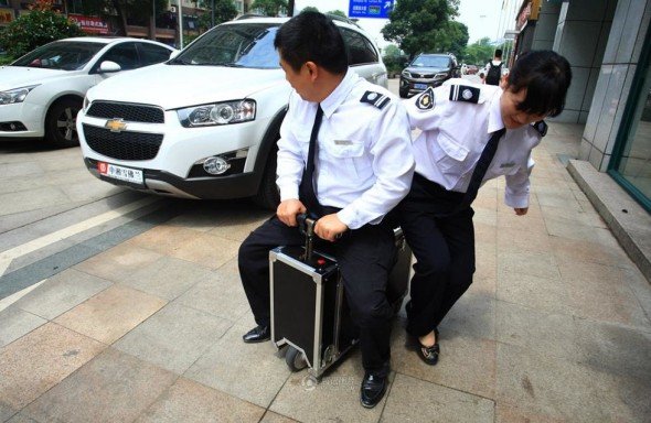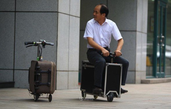 別看這行李箱土土的,它可是已經有發明專利的東西!湖南長沙的農夫賀亮才花了十年的時間靠自己改裝行李箱,並以自己為名將它命名為「亮才牌多功能行李箱」,時速是很安全的20公里,一次電量約可跑50~60公里,可以同時載兩個人(太重的可能不行),並不佔用行李箱本身的用途,純粹像是一個外掛式的電動拖車。