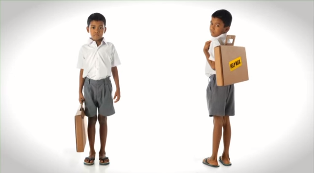 這是一個用回收的後紙板做成的紙盒,不僅可以作為兒童的書包,在上課的同時可以經由凹折,變成書桌。不僅符合回收再利用的環保概念,同時也是一物兩用的有效率設計,還有一個重點是Aarambh僅需提供當地居民回收來的紙箱,接著讓他們可以自行進行生產製作,再提供給學齡孩子們使用。
