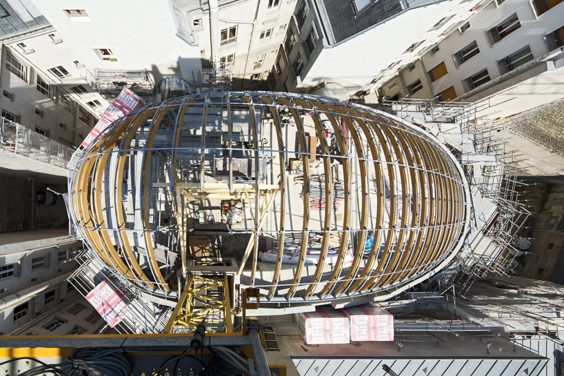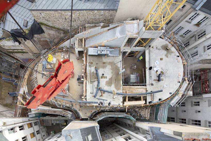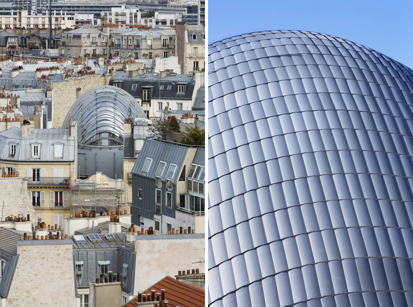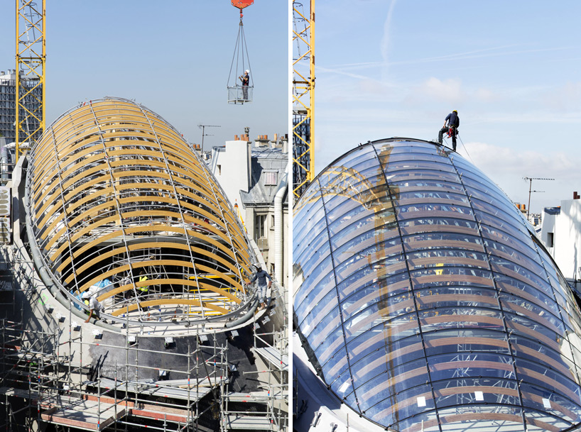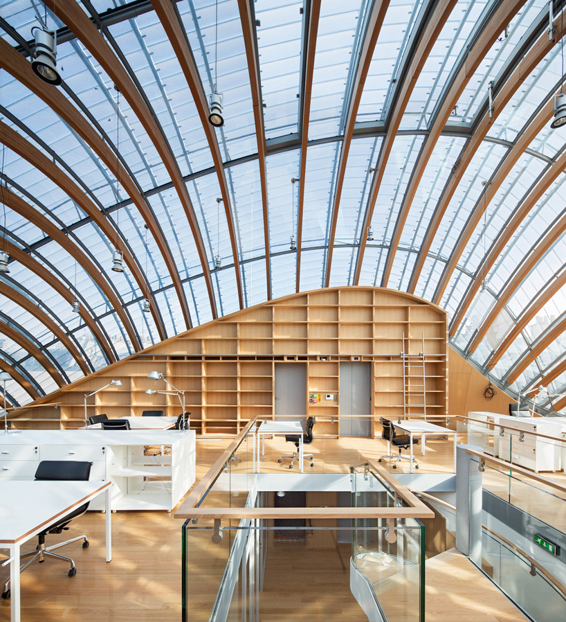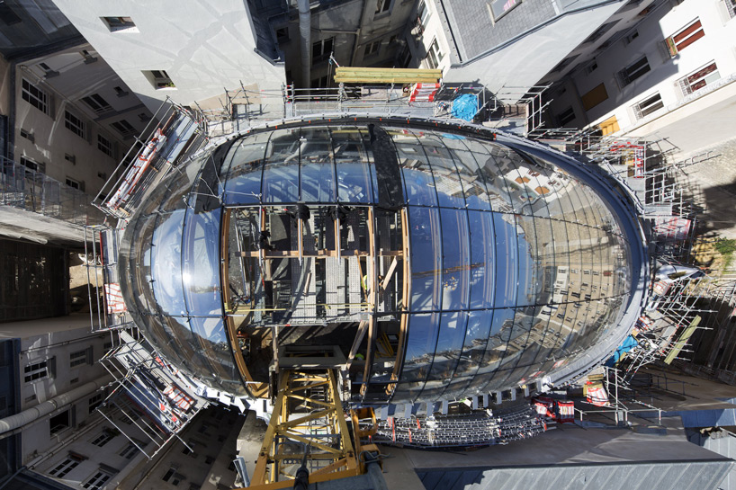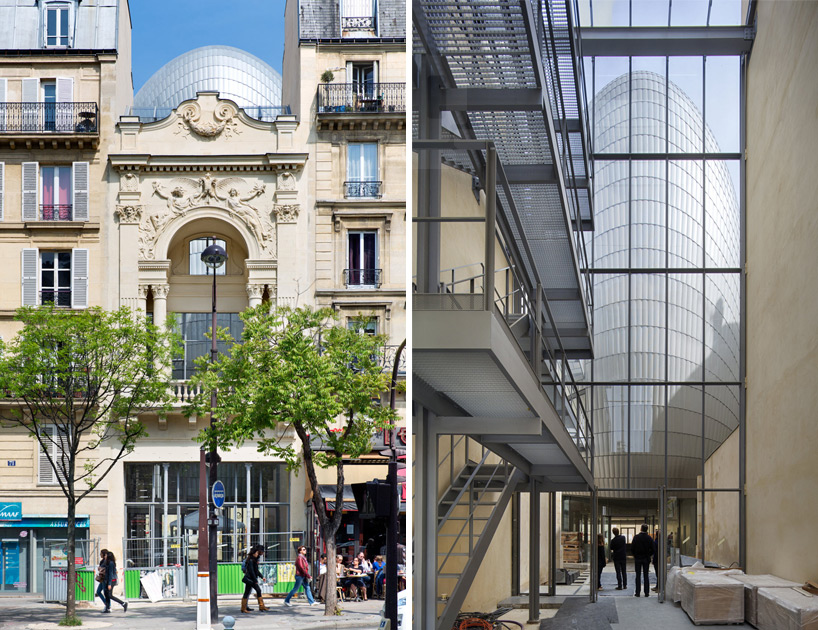 用「塞」這個字其實一點也不為過,為了將就四周原有建築物的限制以及要求,Pathe Foundation總部外觀呈現彎曲的球根狀,外皮拉上玻璃帷幕,看起來就像奇怪的外星生物,但卻能在與四周建築物保持適當距離的同時,為它們引入日照和維持通風,可說是十分「敦親睦鄰」的設計。