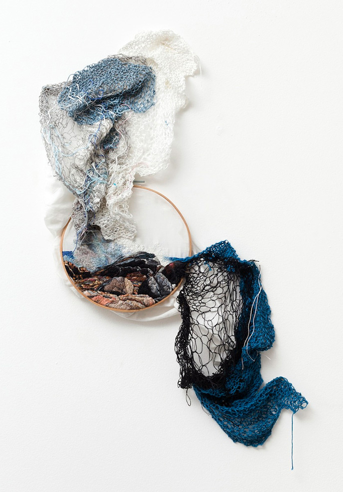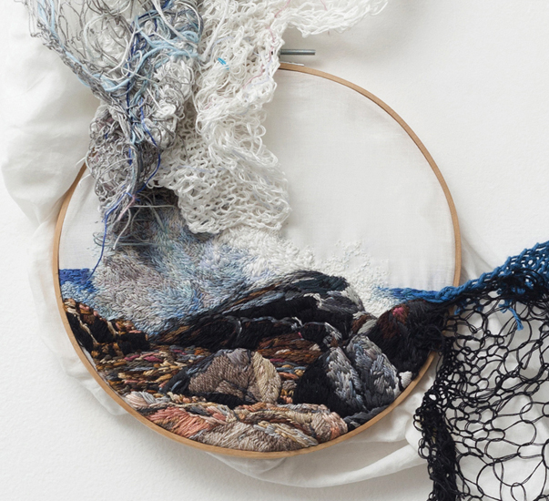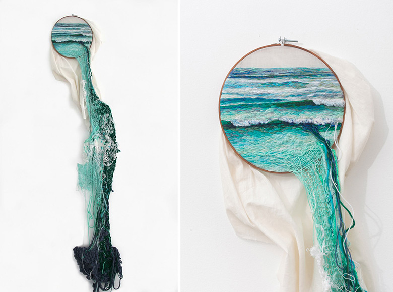 刺繡木框的功能本是用來繃緊布料,方便針線穿梭其中,但如果多點巧思,也能創造出不一樣的視覺效果,Ana Teresa Barboza 在中規中矩的風景刺繡作品加料,讓畫面整個活起來,彷彿海水穿透圓框傾瀉而出的樣子,整個氣勢大加分,讓小家碧玉的女工也能有堪稱磅礡的名家風範!