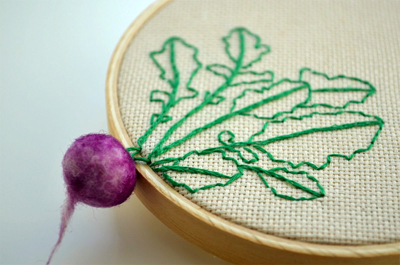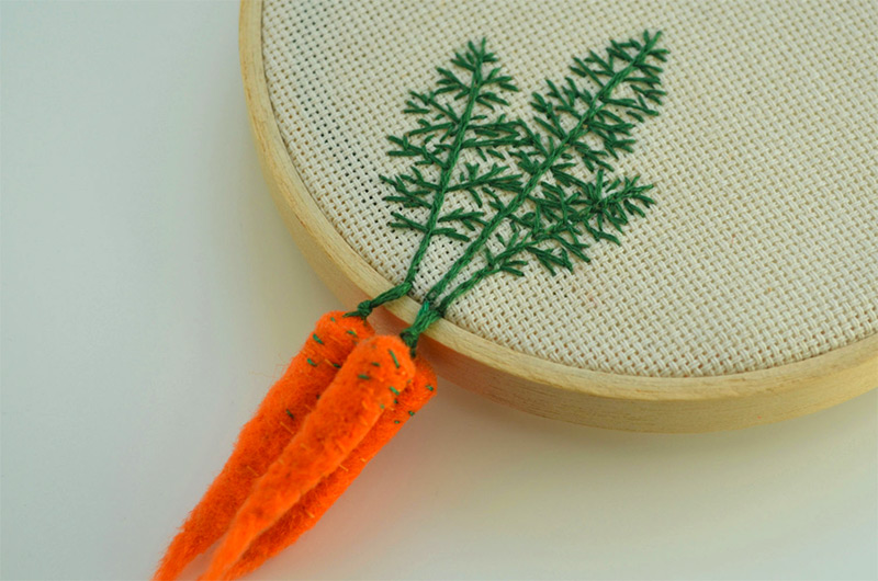 如果風景畫太複雜,也有像這樣刺繡加羊毛氈小品式的手工,小小的胡蘿蔔莫名地有些可愛,有在學刺繡的人應該可以朝這方面加點樂趣。