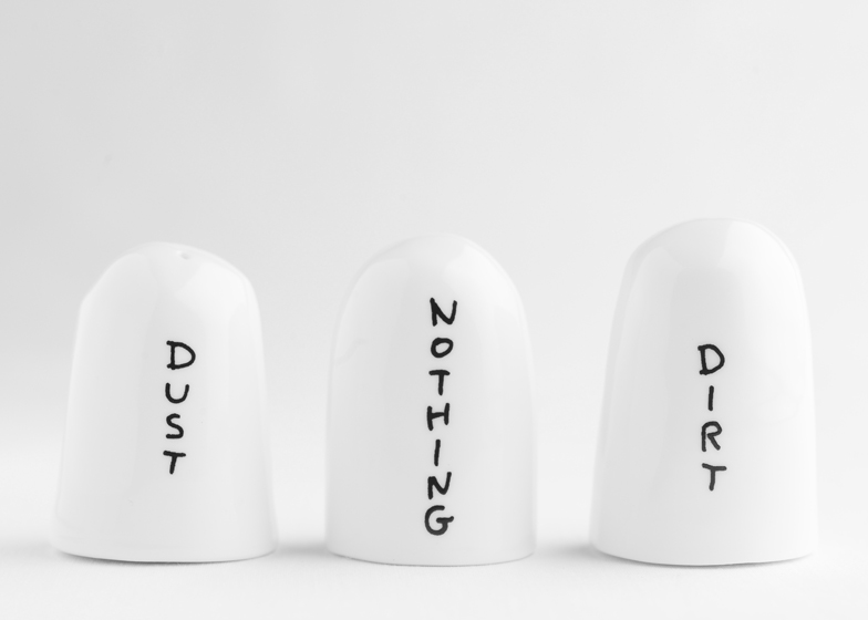 David Shrigley 是個塗鴉藝術家,畫風跟小朋友一樣凌亂,但是惡搞幽默的風格讓他的作品受到人們喜愛,像這三個調味罐,好好的"鹽"、"糖"、"胡椒"不寫,被改成「DUST灰塵」「NOTHING空的」和「DIRT泥土」,只能憑上面的開孔來判裡頭到底裝甚麼,這實在有點調皮阿~~~
