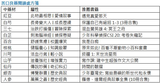 中藥強身健體,誠品書店特選紅豆、白芍、三七、白芷、百合、核桃、川芎、山芋、仙丹、銀杏、人參等十一項藥材主題,依其專屬效能及代表書型,推薦適性閱讀的作品。