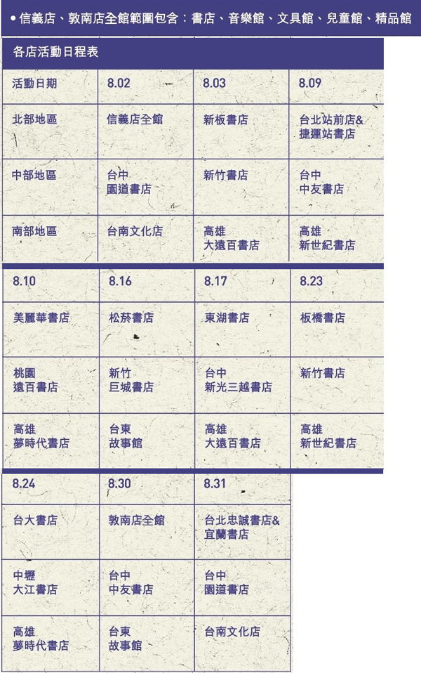 誠品觀察現代群聚生活的多樣新風貌開始從「家」的概念,逐步成為「共居」,共居夥伴可能是單純的室友關係、甜蜜的情侶,或是人與寵物的關係。「家」一路伴隨的血緣家人,開始成為共居夥伴的存在,讓現代人擺脫孤獨,沉浸在「家」的溫暖懷抱裡。誠品為了滿足現代人尋找生活夥伴的需求,透過閱讀生活增強能量,自8月1日(五)起至8月31日(日),橫跨北中南全省巡迴,周末限時回饋全店79折起,活動期間消費額滿1,000元,限量贈送Ann Chen陳怡安手工香皂(市值120元),多種精油味道,為您的美好生活再添馨香之氣。