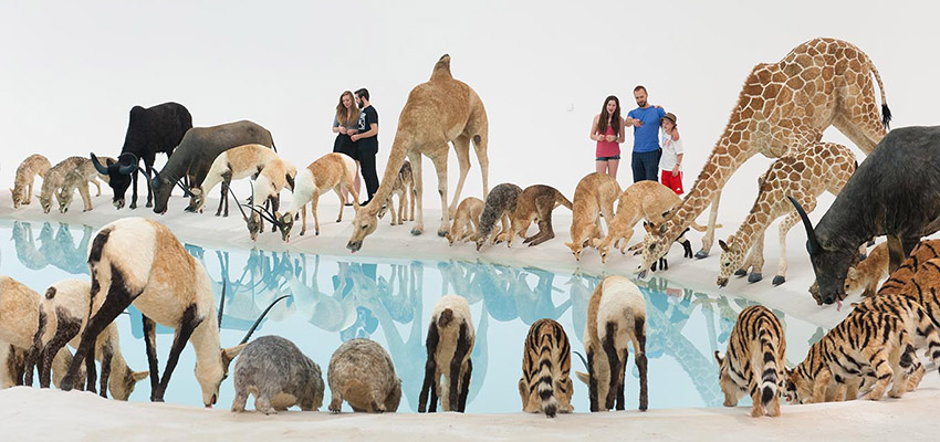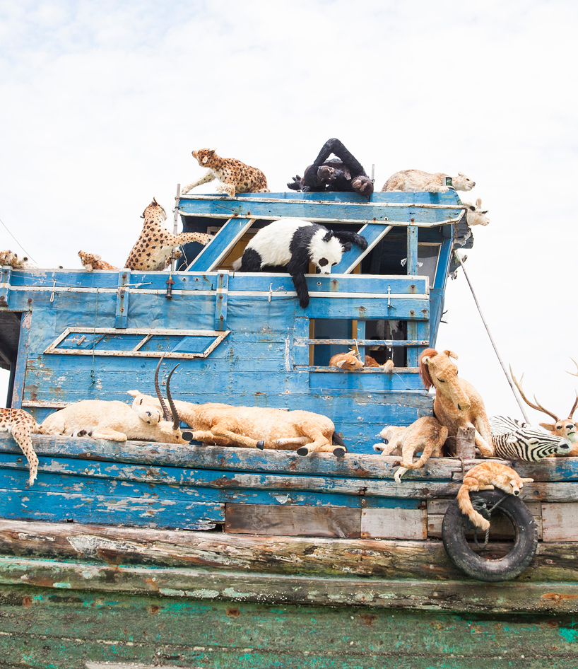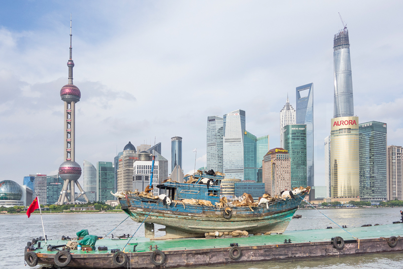 這次在上海引起討論的新作《九級浪》,也藏進人類和環境的關係。蔡國強在展覽開幕前,先製作一艘木船、上面搭載老虎、熊貓、駱駝等99隻擬真動物,和《Heritage 2013》不同的是這些動物全都暈了船,就像是好不容易搭上挪亞的方舟,全都筋疲力盡。這艘木船從泉州出發,由平底船運送到上海當代藝術館外的碼頭。