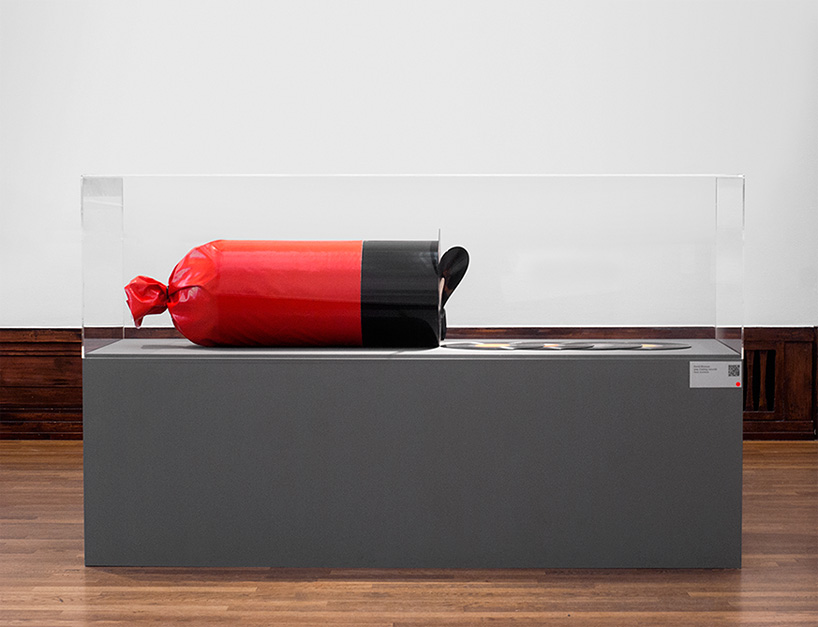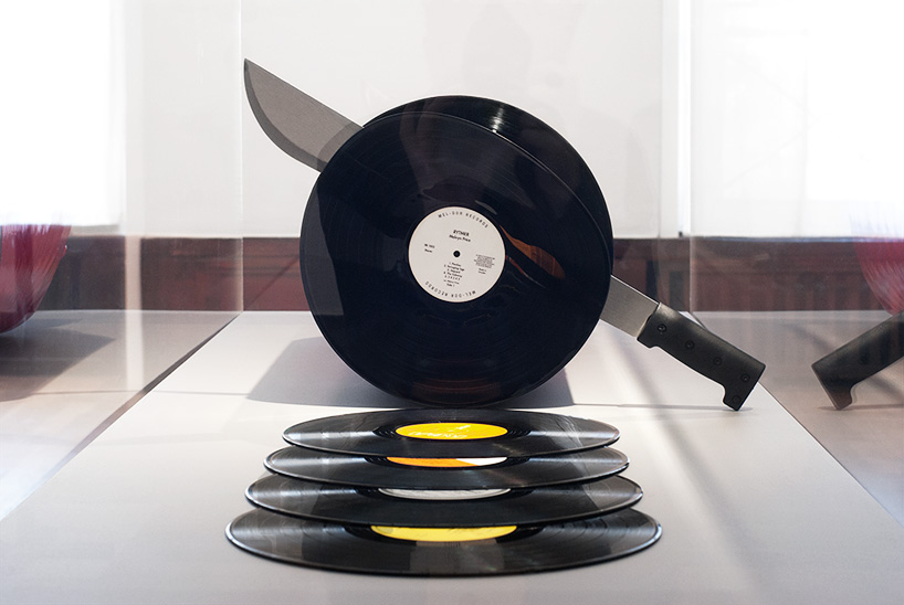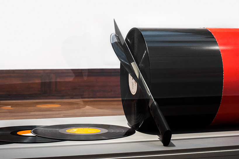 David Rinman 以知名的義大利莎樂美腸(salami)為靈感,末端是紅色包裝的偽香腸,另一頭可看到已經「切」好整齊排列的黑膠唱片,最亮眼的當然就是中間摹擬切到一半的部分,明知道它是裝置藝術,但是看到那個貌似很有彈性的薄片,還是忍不住聯想到各種又香又好吃的義式火腿片,對於有數十種香腸種類的歐洲人們來說,一定相當能了解那種嘴饞的感受吧。