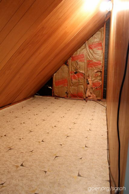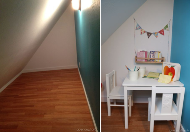 Sarah Goer 大約在男孩三歲時決定要開始改造。他們找了友人幫忙,利用孩子外出上學的時間火速動工,拆掉老舊天花板的木條和地磚,重新粉刷並鋪了新的木地板,再加上簡單的佈置,把小小儲藏室變成能讓每個四歲男孩陷入瘋狂的秘密基地。
