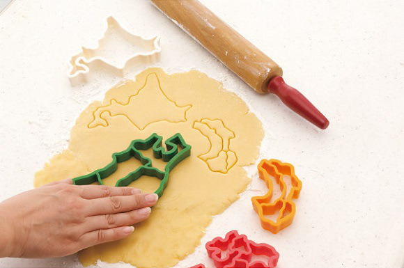 這組日本地圖餅乾模包含了1都、1道、2府、43県,總共47個,並依地區別以顏色區分。和在一般地理課中,老師大多簡略的在黑板上用四個形狀不一的圈圈,代替日本的四個大島不同,這組餅乾模十分詳細的描繪了每個島的形狀變化,而且更具教育意義的是,餅乾烤好之後,可以混在一起,測驗自己能不能拼回完整的日本,或是以糖衣在餅乾上寫下每一都一道一府一県的名字,比隨堂考還更具挑戰性。