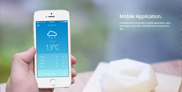 Umbrella Here是一個萬用裝置,不怕雨傘不同就不能用。體積小,並能輕鬆裝卸。現今的科技產品,如果沒有搭配智慧型裝置裡的App使用,好像就會少了點即時性與連結度,Umbrella Here同樣也有手機的應用程式可以安裝。