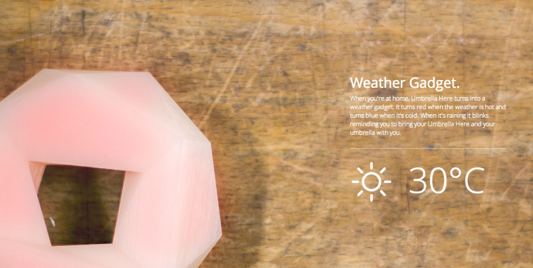 除此之外,Umbrella Here還會根據外在環境溫度變色,溫度高便呈現紅色,溫度低就變藍色。如果開始下雨了,它就會閃爍來提醒我們,記得要帶傘喔!不僅如此,只要登入Umbrella Here網頁,就可以看見所欲前往目的地的天氣如何!可以說是一個行動版的天氣預報器呢!