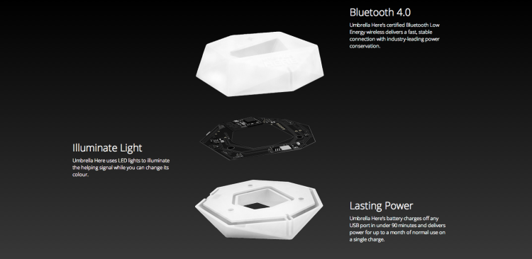 整個裝置是用無線藍牙與智慧型裝置連結。燈光的部份則是選用Led燈。整個Umbrella Here用USB線就能充電。一個半小時內就能完成一次完整充電,大約可以正常使用一個月。