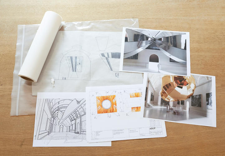 設計師將兩面半圓柱狀的大型鏡面,高掛在畫廊的天花板,兩面鏡子還會往不同方向轉動,創造出空間不停在移動的視覺錯覺。而參觀民眾的身影,經過鏡面折射後所產生的扭曲變形,也讓原本應該是安靜看畫的畫廊,頓時化身為遊樂園裡的哈哈鏡世界,成了名副其實的雙重空間,讓充滿文藝氣息的畫廊多了點現代感的輕鬆。