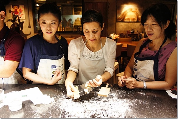麵團醒了 XD,要開始製作麵疙瘩 Gnocchi。老師問,有沒有人要上來玩,機會難得,衝超快的啊我。