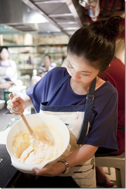 今天的課是兩人一組,這是我和隔壁同學作品。這道特別的神奇小甜心不難,但是因為配方嚴謹,必須完全按照步驟來,我們在 Pepe 老師的指導下,作品很快準備進模烘烤囉!