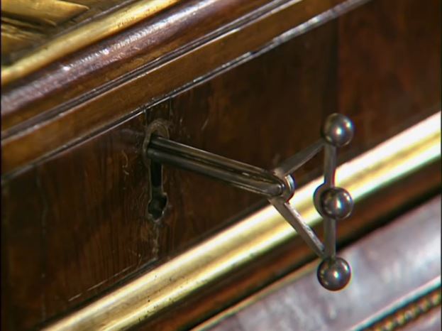 像是這張出自於David Roentgen之手的古董書桌Berling Cabinet,由普魯士國王 Fredrick William II 所擁有,華麗的裝飾、精密的機械設計,以及巨大的尺寸,宣告著皇家級的設計,自然是皇家所擁有。書桌頂端的報時時鐘,搭配鑲嵌工藝所做成的櫃面,本來就已經夠吸睛,殊不知在許多不為人知的地方,隱藏著不起眼的鑰匙孔,以及巧妙融入外觀裝飾的按鈕,按下後,打開的不只是隱藏的抽屜、秘密的隔間,還有人們的眼界和想像力。
