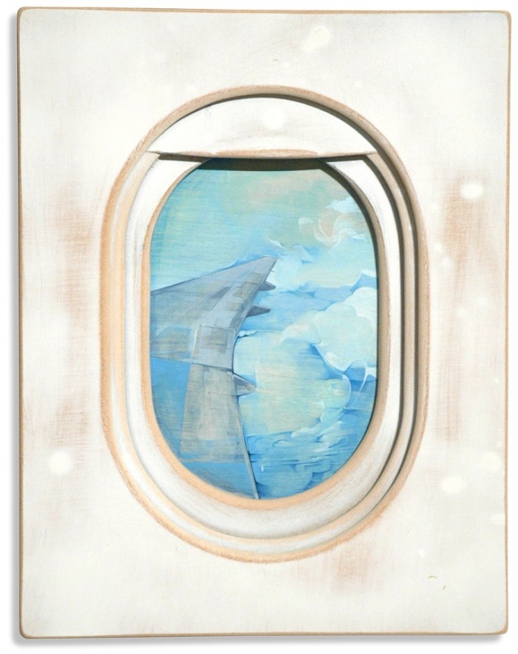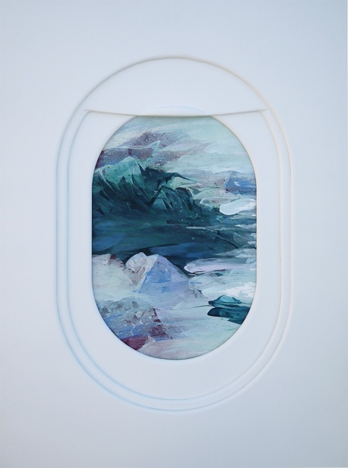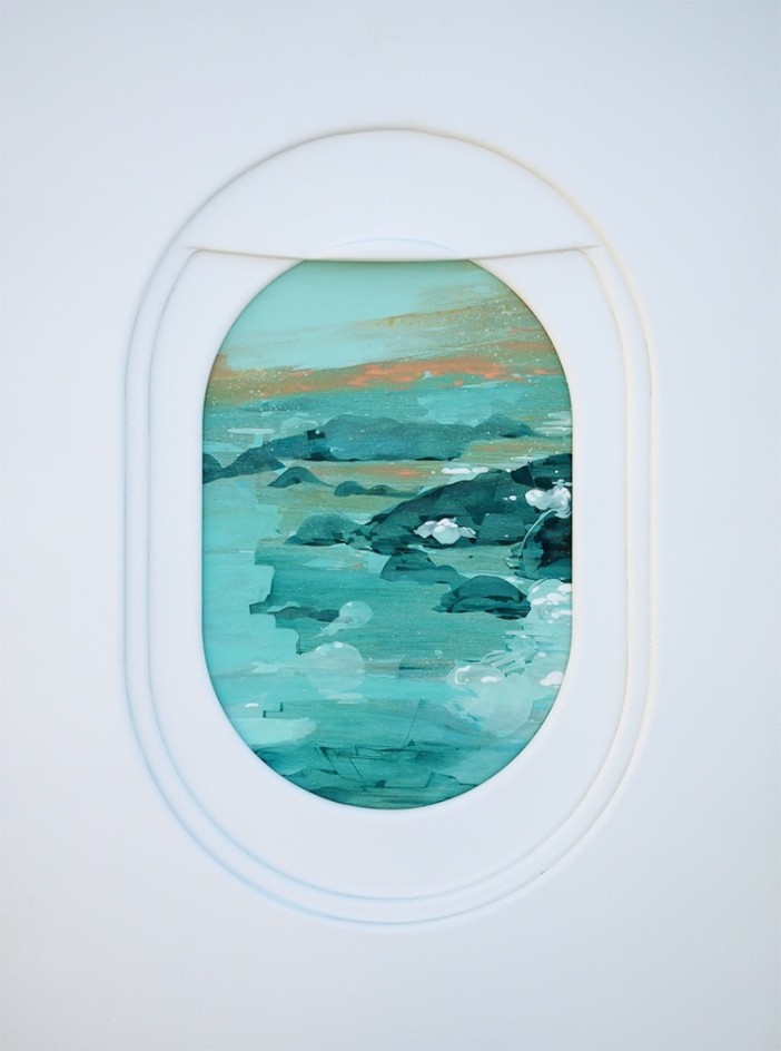 可惜「飛機窗景」可不是說拍就拍得到的,因為先決條件當然是得先搭上飛機,光是這點就有一定難度了,是有點昂貴的拍攝題材,Jim Darling 想要減少這種高不可攀的感覺,於是以繪畫的方式將美景重現,Darling 先以相片記錄下機窗外的風景做為草稿,轉化為壓克力顏料畫之後,再壓上最關鍵的飛機窗當成前景,模擬坐在窗邊向外看的感覺。