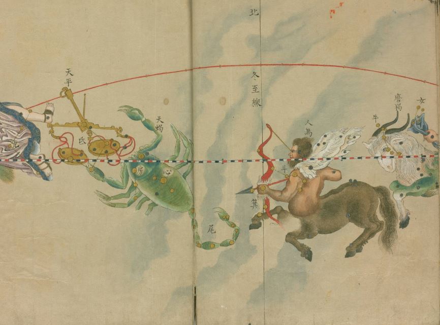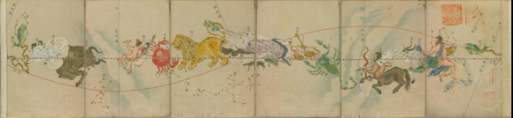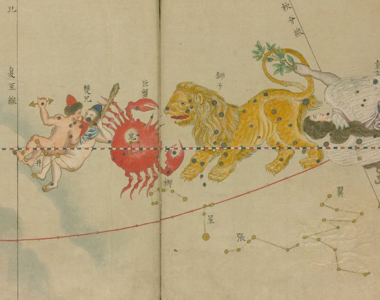 畫中,紅色的線代表赤道,司馬道良在獅子、處女、天秤、天蠍等12個西方星座中,點出28星宿的位置。12星座與28星宿之間的交集與不交集,某種程度上,呈現出過去東西方兩地的人們,如何在其不同的歷史、文化背景之下,定義其所認知的世界。而這樣的理解透過日本寬政年間的日本畫家之手呈現出來,看在我們這些現代人眼裡,更顯出他的獨到見解與先見之明。