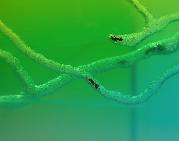 Troemel以勤奮的工蟻作為主角,在九個透明塑膠盒中,注入含有螞蟻所有的必要營養做成特製凝膠,將螞蟻在凝膠內啃咬、搬運、儲存凝膠,以及挖掘隧道、逐巢的過程,一一展現在大眾面前。隨著凝膠被螞蟻咬食後逐漸縮小,甚至「雕塑」出一條條看似不規則、實則充滿螞蟻世界中的運作規則的隧道。半科學、半藝術的真「蟻」實境秀,要是現場再來幾個評審,搞不好還真能搖身一變成為科學展覽吧!