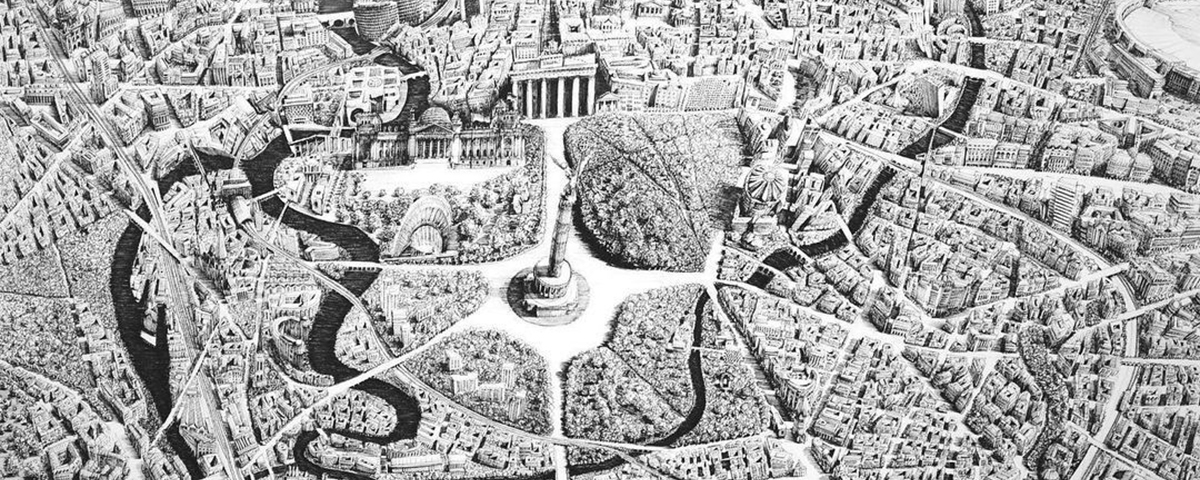 這些緊密錯雜的迷宮、建築畫作彷彿有種魔力,讓人第一眼就被深深吸引!一幅又一幅呈現出深刻立體感與精緻細節的超現實的黑白城市圖都是美國插畫藝術家Ben Sack(Benjamin Sack)以針筆一筆一劃描繪出來的作品!
