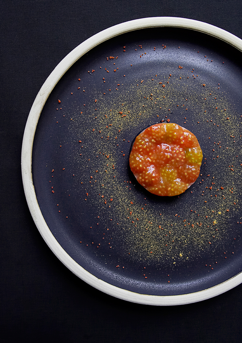 大西洋小龍蝦卵點綴番茄,又是一個同心圓的擺盤方式,特別是由上往下看,番茄的紅色在厚實的黑色盤子中,格外顯眼。