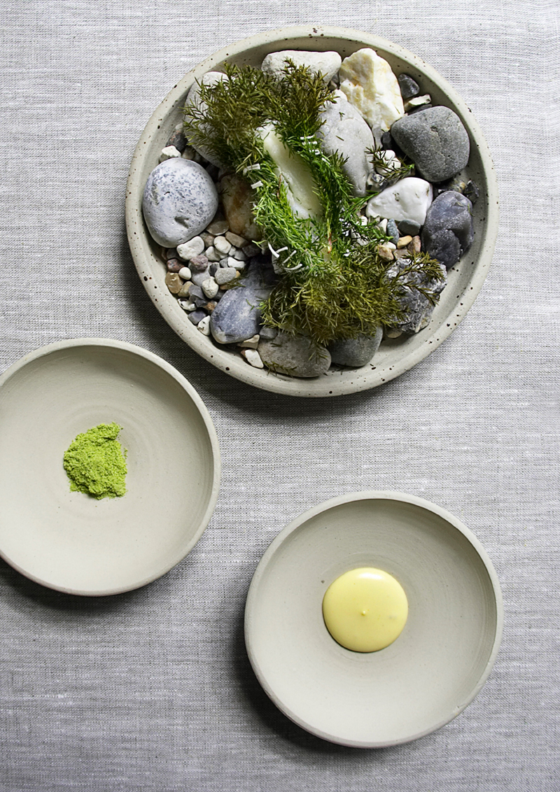 在石頭上擺放著一小撮杜松,突然讓人有點分不清楚,這究竟是某種日式風格的庭園造景?還是可供食用的餐點?