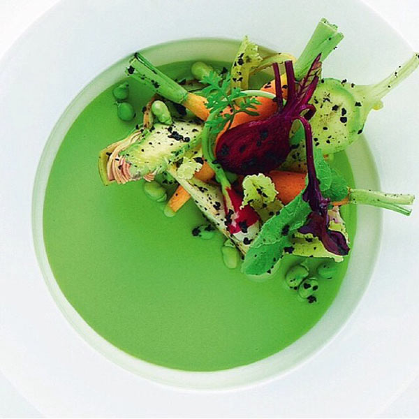 鮮明的綠色醬汁,對比著蘿蔔、紅蘿蔔、紫洋薊、碗豆等春季蔬菜的鮮艷色澤,以五比五的精準比例,在視覺上切割成互不相讓卻也互相襯托的危險平衡。最後再灑上點黑色的松露點綴,一整個完美上桌!