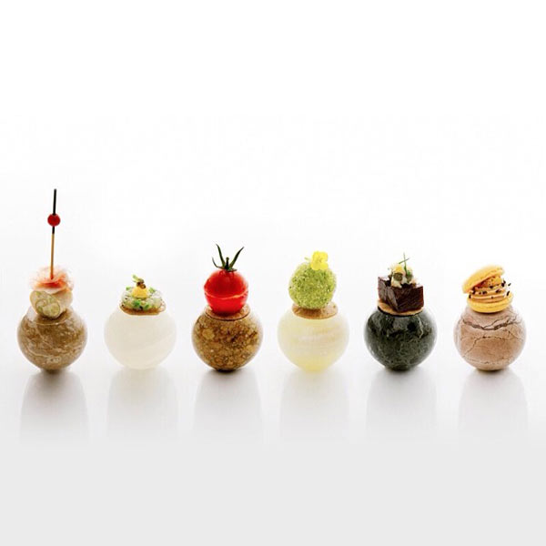 走著小巧可愛風的球形底座,頭上頂著等番茄涼菜湯、炸魚丸、牛肉凍、馬卡龍各式前菜,造型上充滿趣味之外,每一口都是不同的體驗,從極凍到燒燙燙,各種溫度都有!