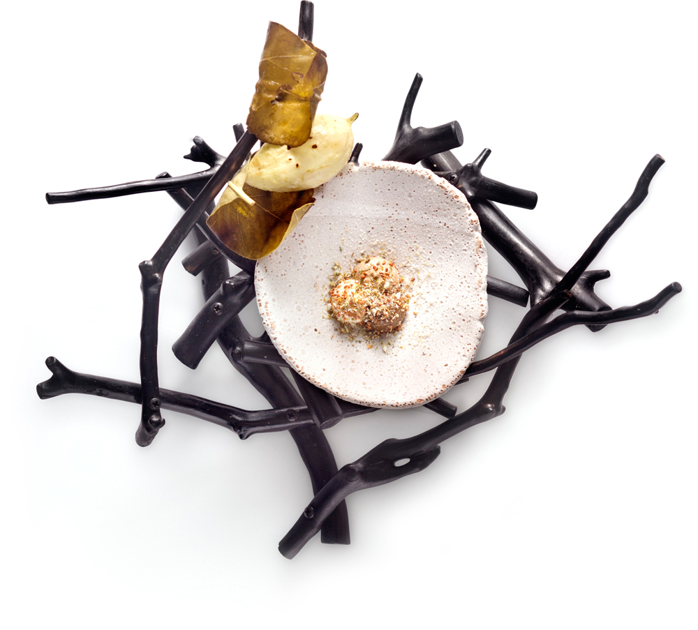 交錯的黑色樹枝中,穩穩的端著邊角帶點粗糙破損的瓷器餐具,呼應著盤中的小黃瓜,是包裹著漿果鵑木葉後再烘烤而成的複雜工序,完全跳脫想像的料理,不曉得吃起來是什麼味道呢?