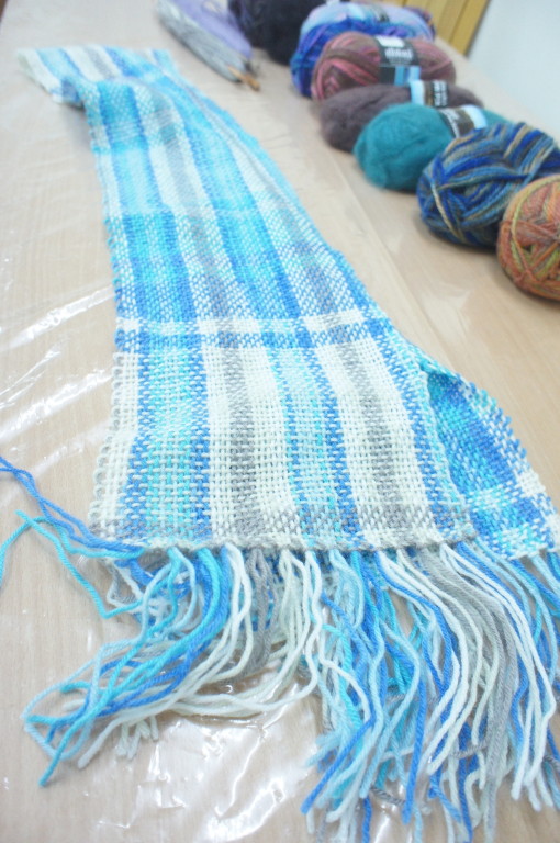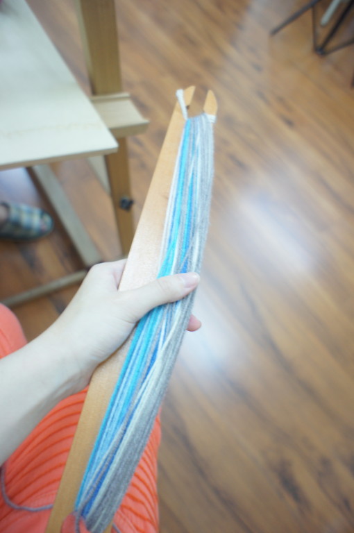 中間我有一度不小心在過程中整理到一半的經線整個掉下來,好險老師出手相救!這是我第一次用織布機織圍巾,以前我曾經玩過棒針、鉤針,印象中只要錯了就很麻煩,但是老師說,用織布機的優點,就是都可以有補救的機會,只要把手續往回幾道,就可 以調整回來,實在太適合一不小心就會分神的我了!