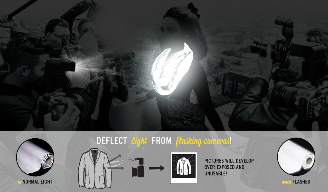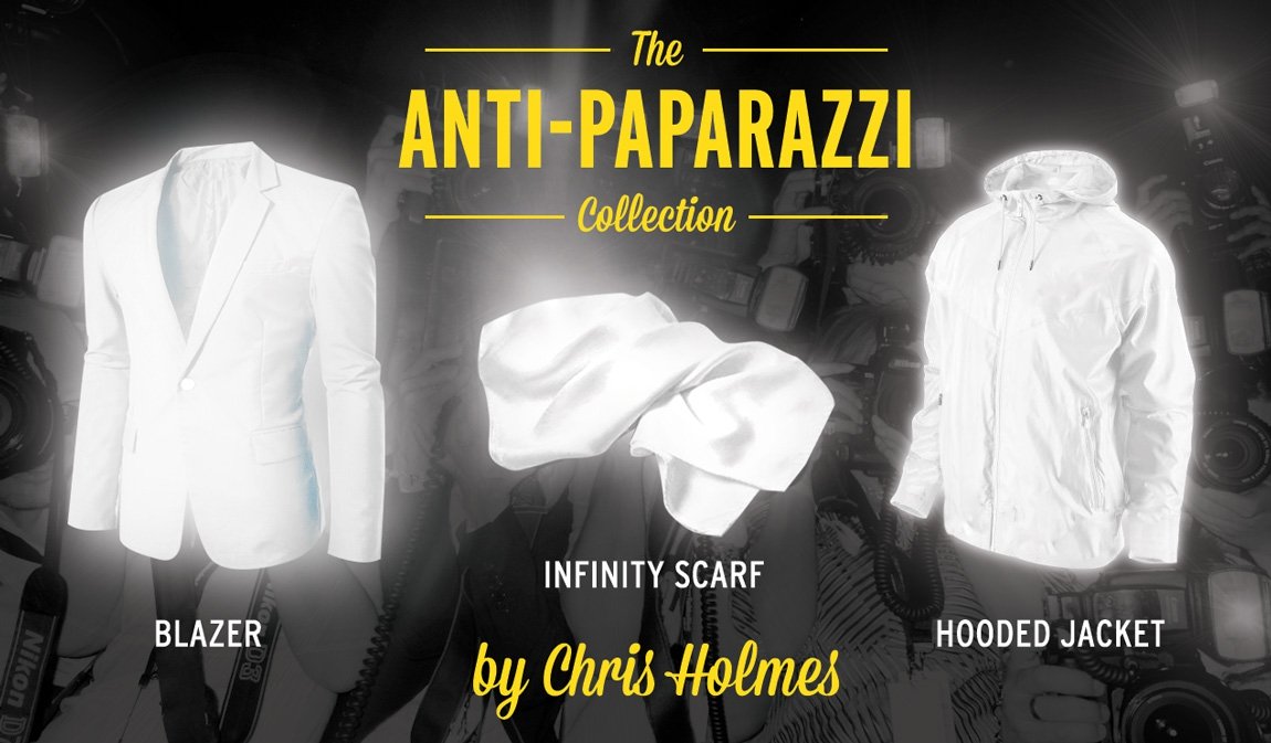 Holmes 發現,他過去表演時,每每穿著反光材質的表演服所拍下來的照片,最後都一整個大曝光,因為當閃光燈遇上反光布料時,會將閃光燈反射回去,使得拍下來的照片除了衣服亮亮的一片以外,其它部分都暗迷濛。他將這個原理應用在正常服飾中,設計出一系列反狗仔服飾,有連帽外套、有圍巾、西裝外套,穿上後,包準再厲害的大砲都拍不出能見人的照片,完全達到「被人看見,但不被人拍照」的最佳效果。