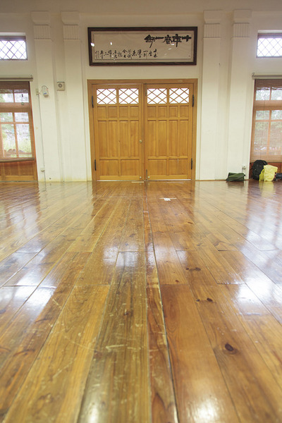 從大門的中間看,可以看到兩邊地板有明顯的不同,一間道館建造的好不好,影響最大,感受最明顯的,就是地板,因為這個館是為了柔到與劍道上課用,傳統劍道場的木地板結構,厚杉木地板下架空,架成矩陣的木板由厚粗的彈簧支撐,良好的地板彈性使練武之人不易受傷,並且會發出強大的聲響,古老的道場,甚至在下方放上巨大的甕,增加發聲來威嚇對手。