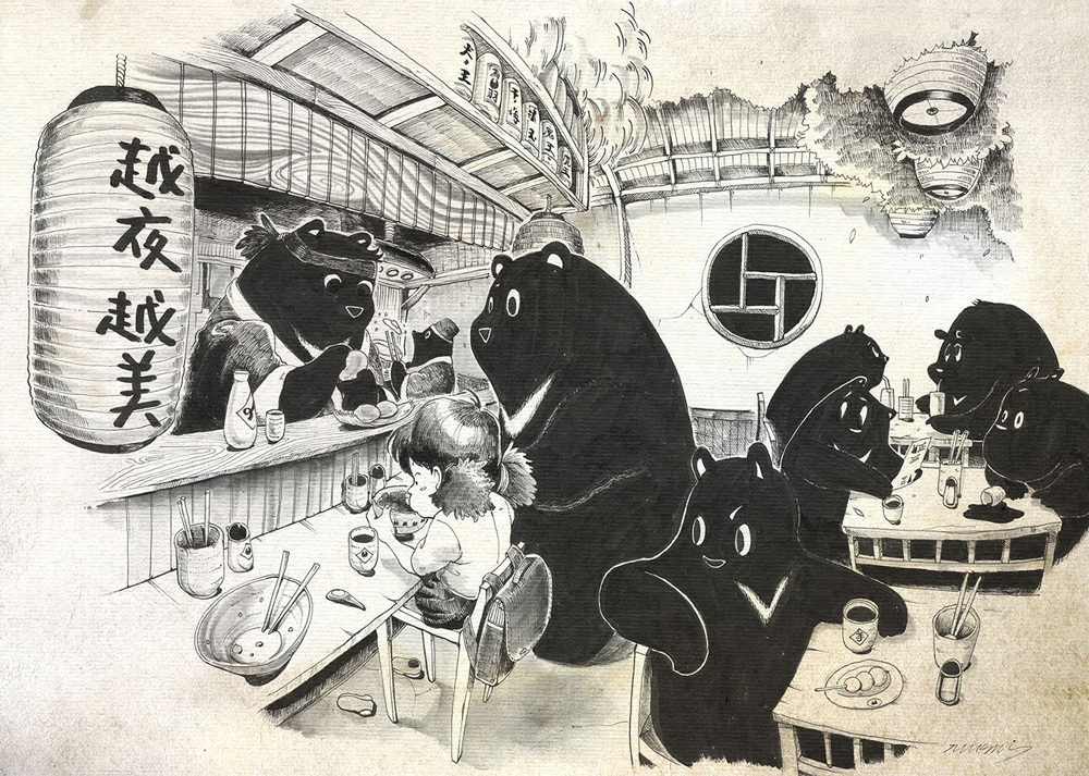 阿福--- 維修工人,是一隻台灣黑熊,九份的九戶原始居民之一,因著黃金時代所帶來的人潮,而被迫隱居起來。然而在遷徒的過程中來到了當時貓老闆居住的地下洞穴,於是貓老闆運用著他的魔法與黑熊合作,建造了地下空間,開啟了地下世界的文化。很想有機會可以再到人類的世界看看,但每次到了洞口就覺得人類的世界很危險並打退堂鼓。卻在有一次修理機器時意外發現了人類入侵的蹤影,展開了一連串奇妙故事。
