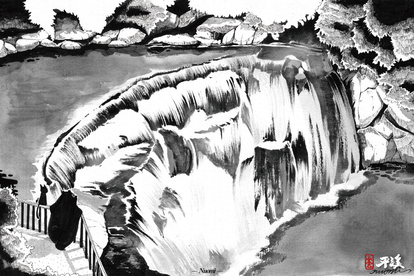 「在這瀑布底下修行一定很厲害!」「恩,除非你有個夠硬的脖子喵!」