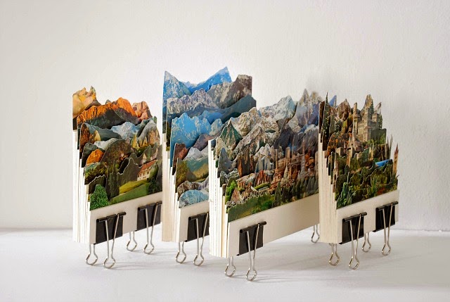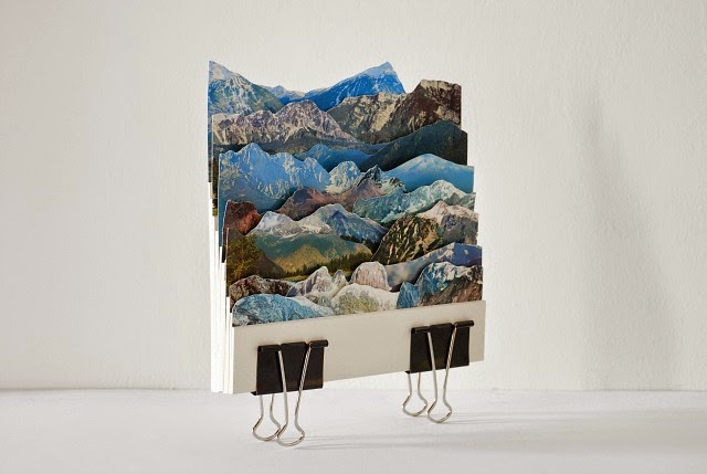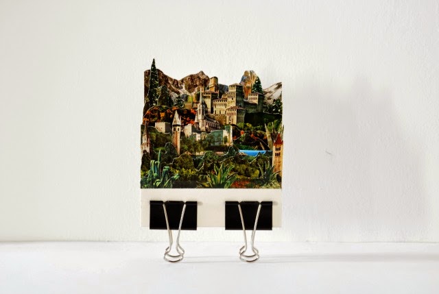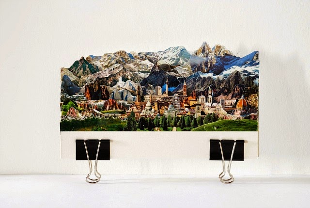 Rossato所設計的明信片,大部分是以建築物和風景為主,Rossato會用X-Acto刀片,將圖片一一解構後,然後重新排列成新的圖片,就像美術拼貼一樣,隨著不同的元素一層層重新堆疊上去,圖片原有的辨識度也隨之一層層滑落,直到成為Rossato幻想中的世界。
