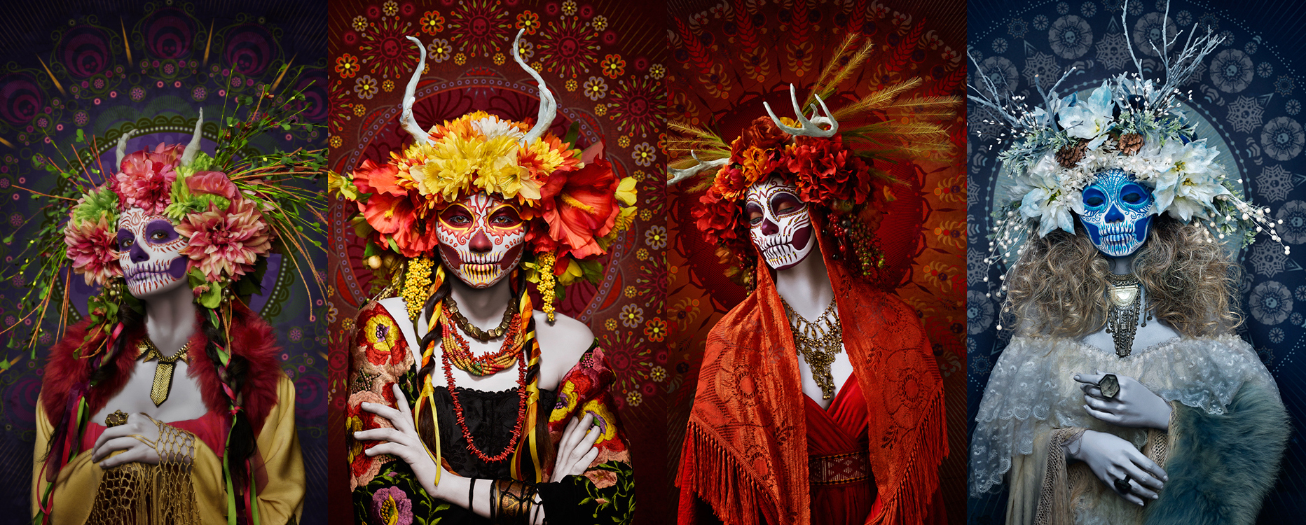 攝影師 Tim Tadder 在看到藝術家 Krisztianna 為墨西哥亡靈節所創作的四季雕像後,決定與 Krisztianna 合作,並找來造形師 Julia Reeser,拍攝以春、夏、秋、冬為主題的亡靈系列作品 Las Muertas。照片中,僅管每位亡靈冰冷的表情,配上陰沉灰暗的乾枯大地做為佈景,十分貼近一般人對死亡的印象,然而他們身著華麗的服飾,臉上滿是色彩鮮艷的骷髏圖騰,以及頭上爭妍鬥豔的花朵,卻充分的訴說著亡靈節「不夠歡樂就不夠尊重往生者」的風俗民情,讓人忘卻死亡的陰霾,只見到生命的美好。