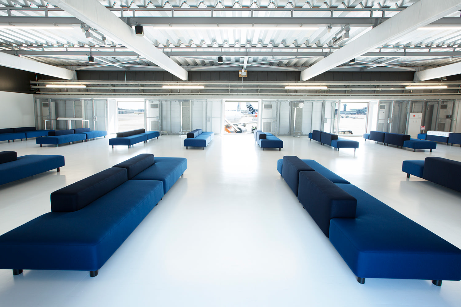 偌大的場地十分素雅簡單,候機區的沙發椅約可容納四百名旅客,兩兩一組的座位前後留有寬走道,讓旅客們保有一定的個人活動空間。