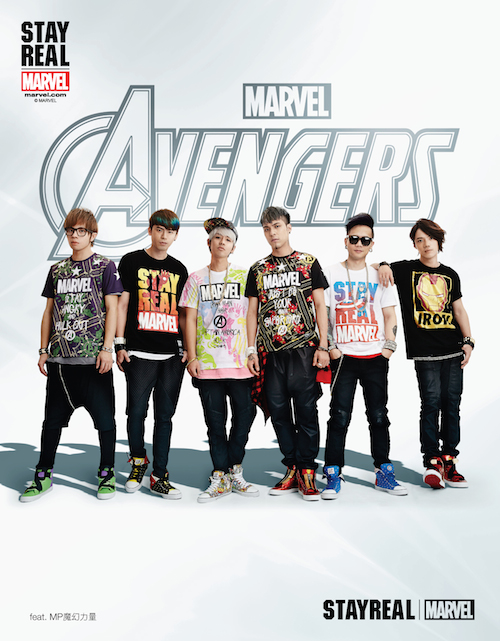 STAYREAL重新創作全新的Avengers視覺,將STAYREAL的品牌元素與超級英雄元素充分融合,推出推出復仇者聯盟翻玩圖騰聯名T-shirt、人物限量鞋款、以及創意生活小物等設計商品。而且請到五月天阿信欽點的新世代天團-MP魔幻力量為這次的重磅合作來代言,透過MP魔幻力量鮮明前衛的形象,傳遞最獨一無二的街頭時尚品味,在服裝、電影與音樂的三方跨領域結合之下,將帶給復仇者聯盟粉絲、及喜愛流行時尚者煥然一新的新鮮感。