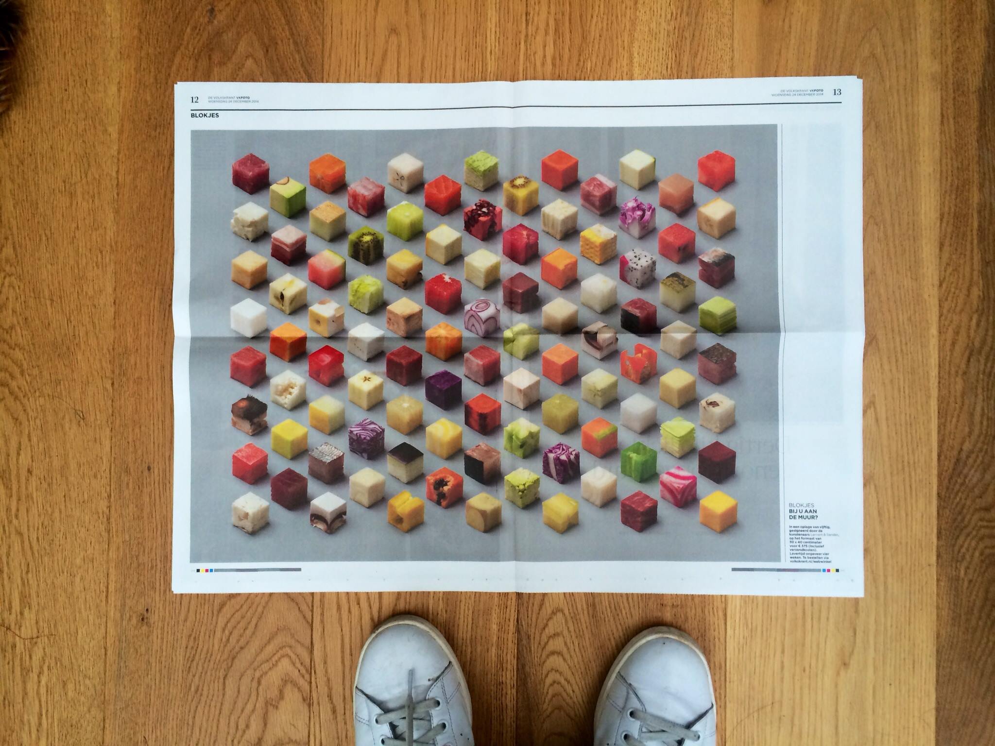 荷蘭藝術家 Lernert Engelberts 和 Sander Plug 兩個藝術家兼好友,從 2007 年開始合作以來,推出過不少概念影片和裝置藝術。去年底他們與荷蘭報紙 de Volkskrant 合作,以食物做為主題所推出的特別攝影作品『Cubes』,把 98 種食材切成正正方方的立方體,2.5公分x2.5公分x2.5 公分的精確尺寸,就像得了強迫症一樣,以最精準的 45 度角整齊排列、面對鏡頭,不知道正準備進食的人,看了食慾會不會受到影響,畢竟吃東西應該要是件令人放鬆、愉悅的事情,實在不需要搞得像行軍一樣一個命令 一個動作,但至少在鏡頭前,每個食物看起來都色彩繽紛鮮豔,不禁令人好奇,如果把它們相互搭配、組合,能做出什麼樣的美味佳餚呢?