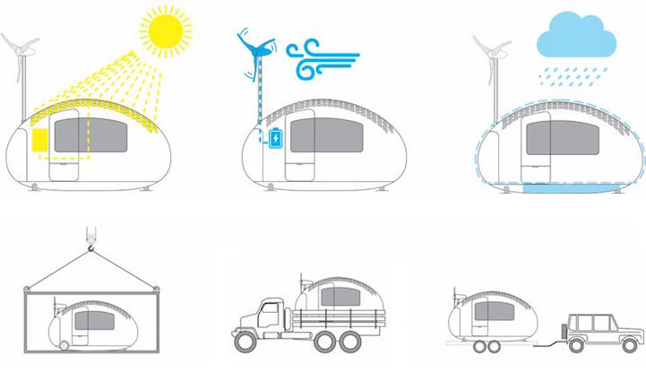 除了當成露營車之外,Ecocapsule 內部的收納空間,也可以使它搖身一變成為簡易的行動實驗室,旅人休憩用的旅舍,或甚至是提供人道援助使用,特別是在水電中斷的災區,完全使用再生能源的 Ecocapsule,至少可以提供災民一個比較舒適、等待回到正常生活的過渡空間。