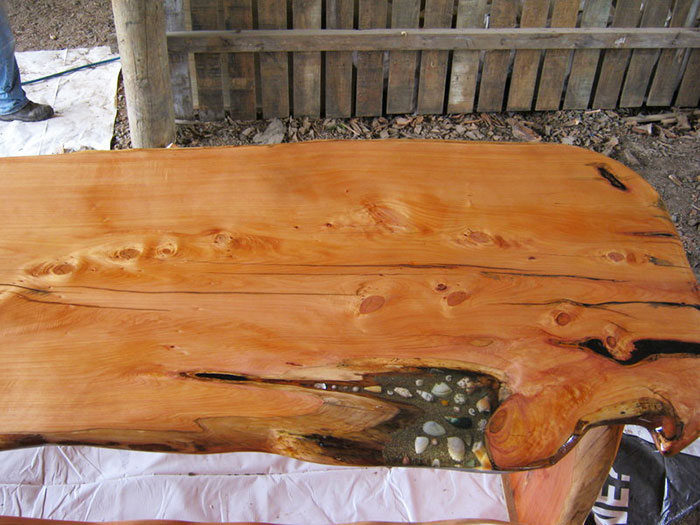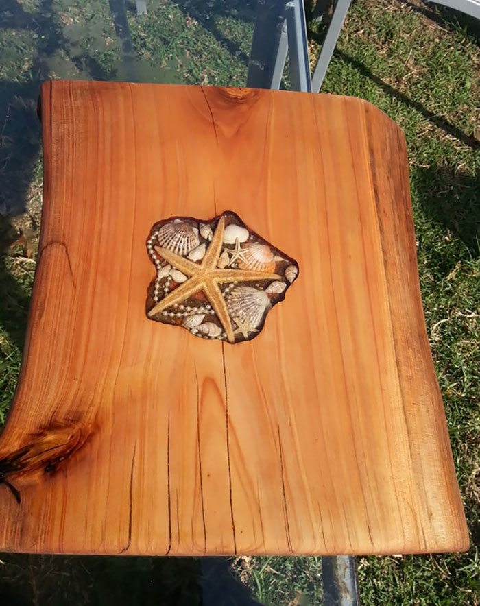 透明樹脂加熱會融化,具有高度可塑性,完全乾燥後相當堅硬,是不少手工創作者的最愛,對於國外 DIY 玩家們來說更是不可或缺的原料,紐西蘭 Woodcraft by design 分享了一系列作品,在木板的裂縫處灌入樹脂和海邊收集來的貝類,原本被傢俱業者淘汰下來的木材,瞬間就成為特色海洋風桌板,放在島嶼民宿或者海邊渡假小屋都相當適合!