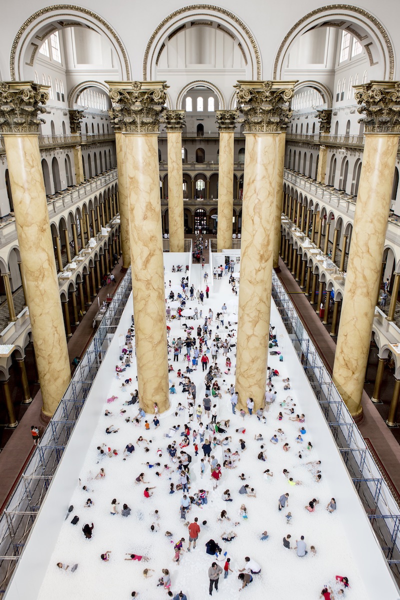 在 48 公尺長的"泳池"裡,人們可以放下束縛在泡泡球中玩耍,玩累了就側邊的海灘椅上歇息,就像一般人會在海邊做的事,唯一不同的是地點被搬到 National Building Museum 裡頭,藝術的沉靜和熱情海灘之間的衝突感相當迷人!