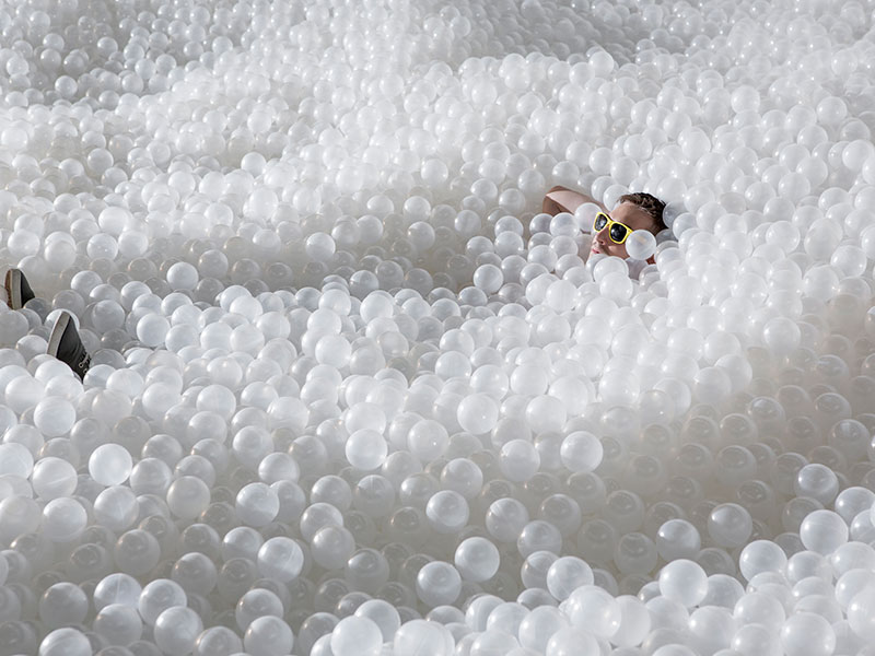 如果要說到親民藝術,華盛頓的國立建築博物館(National Building Museum)應該是很好的典範,因為它把自家的中庭改造成室內遊樂場,以「海灘 the Beach」為名,放了將近一萬顆透明泡泡球和幾張純白海灘椅,讓大人小孩都能在裡頭盡情玩耍打滾,重點是,還有冷氣吹喔!(握拳)