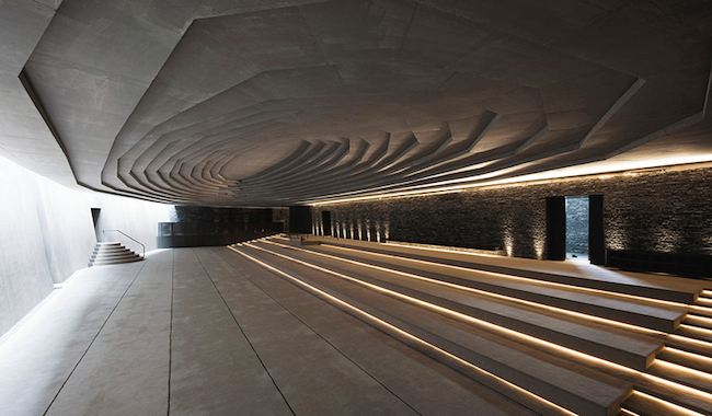 平緩的深色石牆伏於地表,沿著地勢緩緩下旋,最後才遁入室內空間。這座清真寺Sancaklar Mosque落於伊斯坦堡市郊,遠離城市的喧鬧和所有交通幹道,是EAA-Emre Arolat Architects企圖拋開建築理論,專注打造一座僅服務宗教核心精神的建物。最外圍的高牆象徵阻絕世間紛爭,保留其內不受汙染,走進祈禱室中,外頭瀉入的陽光增添肅穆氛圍,教徒們能在偌大卻空無一物的空間內,面向牆面(Qiblah Wall)虔心膜拜,找回內心的平靜。