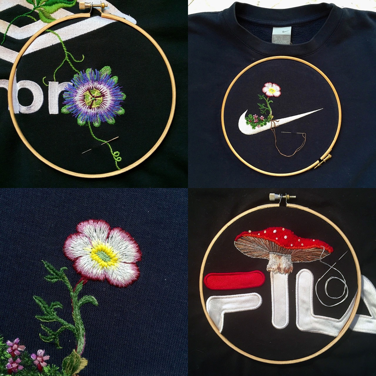 汗水、爆發力、速度、和激情(?),大多運動品牌的形象,都是走著簡潔有力、帥氣英挺的風格,才符合運動員充滿朝氣的感覺,不過藝術家 James Merry 以刺繡將花花草草與這些logo結合之後,卻也不會不搭調,反而多了點不同的詮釋,像是在 Nike 閃電般的勾勾上頭,繡上一朵可愛的冰河小花和苔蘚,盛開在這麼艱苦的環境中,好像訴說著堅忍不拔的阿信精神。而 FILA 上頭的可愛蘑菇頭,難免令人想起了瑪莉兄弟。