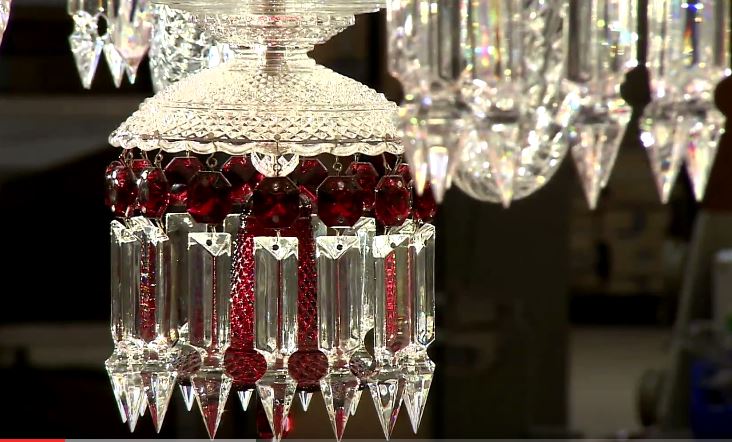 水晶是由二氧化矽砂、碳酸鉀等原料混合而成,經過高溫加熱,然後拉長、扭轉做初步的塑形,然後以鉗子「剪」出適當的長度,放入模子中定型,等到完全冷卻後,再與其他零件組裝成吊燈。影片中,工匠們熟練的夾起被燒紅了的水晶,進行一道道工序,看起來駕輕就熟,好像三兩下就能輕鬆完成,其實背後隱藏了多年的經驗與工夫,而且過程中還要忍受高溫的工作環境,可不是影片中看起來那麼輕鬆,所以......下回如果進入飯店時,千萬記得多看看飯店內的吊燈幾眼、多多欣賞它們的美喔!