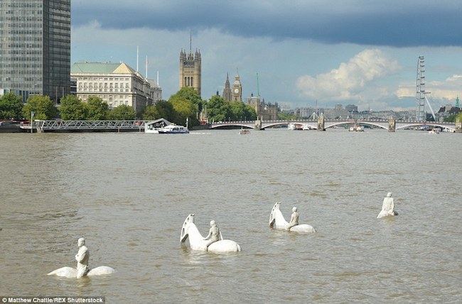 今年9月,英國泰晤士河邊有四個人騎乘在馬匹上,凝視著遠方靜止不動,彷彿準備渡河,但河川漲潮後,他們逐漸被水淹沒,直到滅頂。這四尊人像是英國藝術家泰勒(Jason deCaires Taylor)的雕塑,只有退潮時才能欣賞。