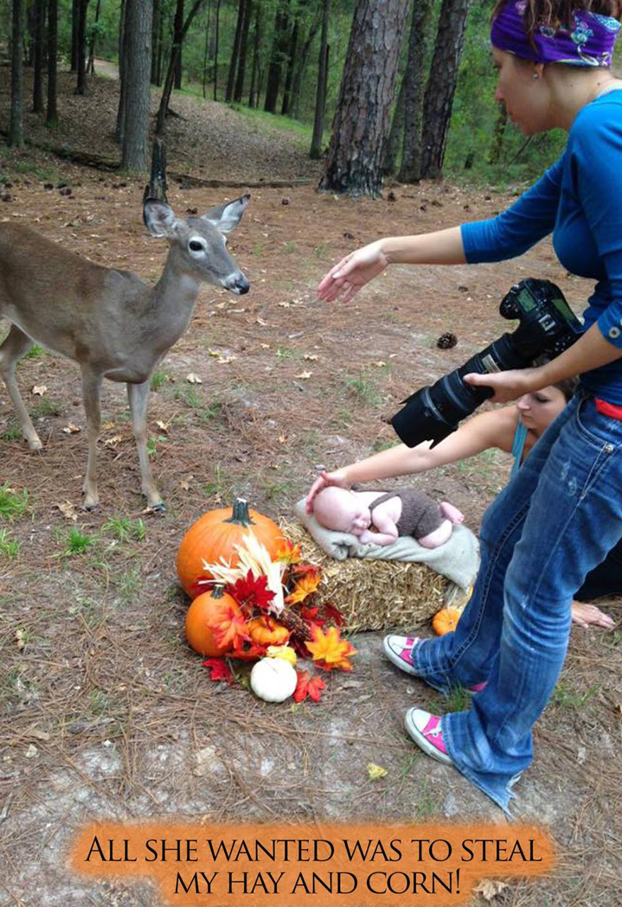 當只有一個月大的小嬰兒 Connor 被攝影師 Megan Rion 和媽媽安放在稻草舖成小巢,準備拍照時,誰也沒有想到公園內的小鹿會在這時候出現,讓攝影師拍下這個比童話還更有童話風的嬰兒沙龍照!