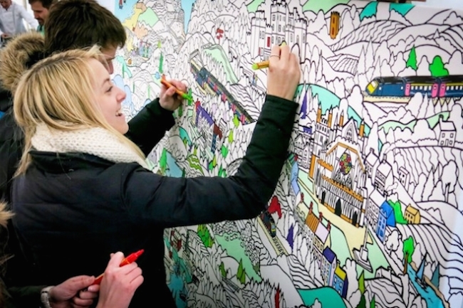 自 2011 年起,藝術家 Maria Leyden 和 Chris Mason 就開始幫各類型的活動準備「大型著色畫布」,並在活動會場邀集參與者一起添加顏色,不僅讓活動變得有趣,合力完成的畫作也很有紀念意義。他們主要的客戶有慈善團體、大型企業、學校和婚禮,曾創作出超過百幅著色圖樣,還會根據客戶的喜好客製草稿,把對方想要的圖樣融合進著色畫裡。