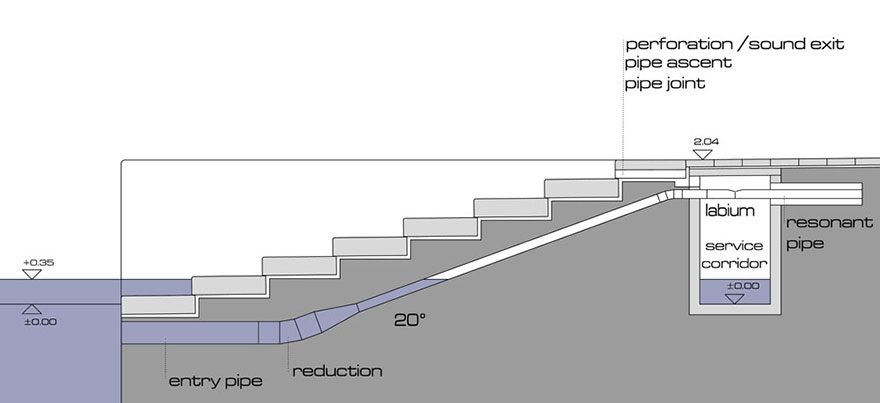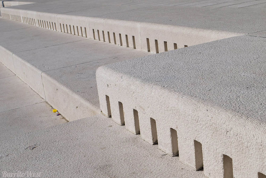 克羅埃西亞建築師Nikola Basic在亞得里亞海海邊建了七組230英呎(約70公尺)長的石階,每當海風與潮汐灌入石階上頭的孔縫中,就會沿著導管流向共鳴管,發出聲音,成了由大自然為大家演奏的海洋風琴。七組石階代表七個音階,每個音階裡面通過不同的管道表現出5個音調,因此產生的聲音幾乎是隨機分配,然而所發出的樂聲意外的協調、悅耳,而且每天都是不同的樂章,就好像是多產的音樂家,每天為大家開上一場曲目完全不同的演奏會。